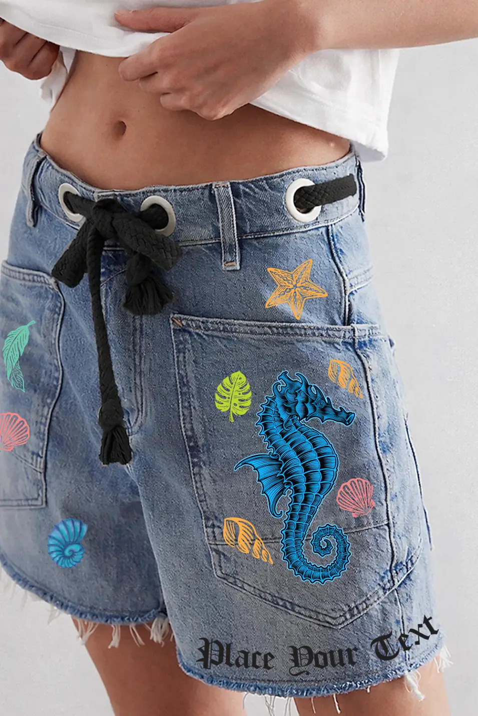 The design blends edgy streetwear style with artistic detail, while the customizable text lets you add your own name or message for a truly personal look. Relaxed fit, frayed edges, and utility pockets — perfect for casual outings.
