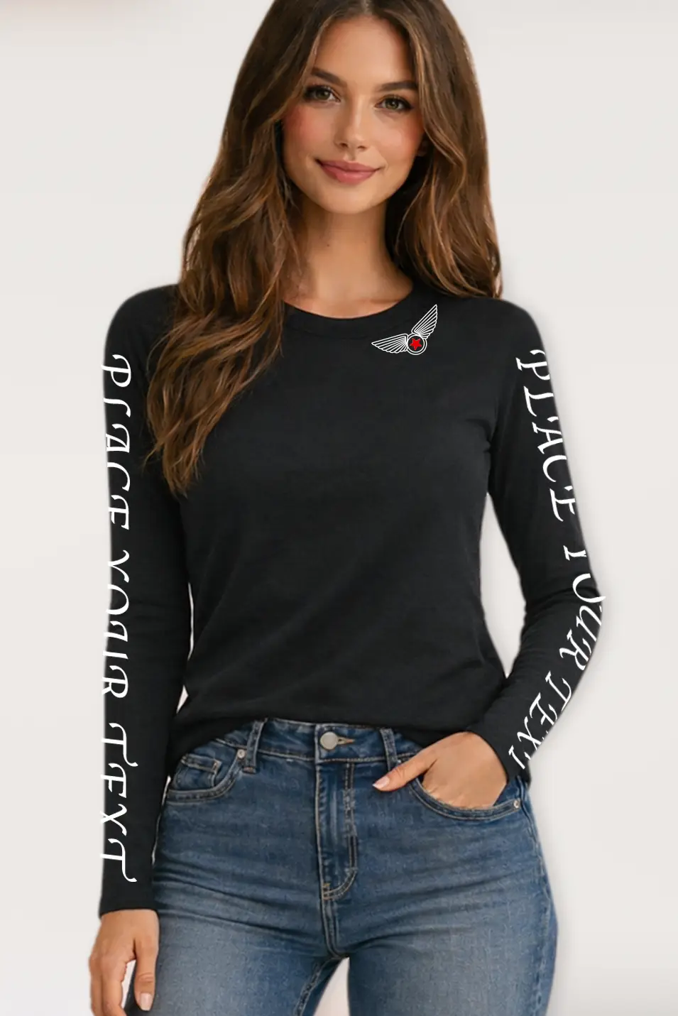 Slim fit long sleeve top designed with an elegant bold gothic typography on the sleeves. Personalize the text and make it uniquely yours.