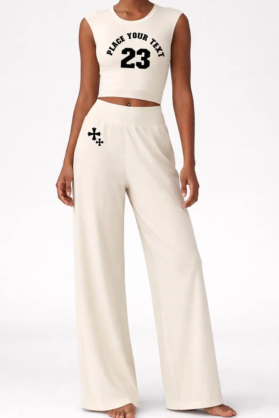 High-waisted flared design for tummy control and leg-lengthening effect with top features a cut-out racerback design, offering a comfortable and breathable wear. Personalize the text on the chest to make it yours.