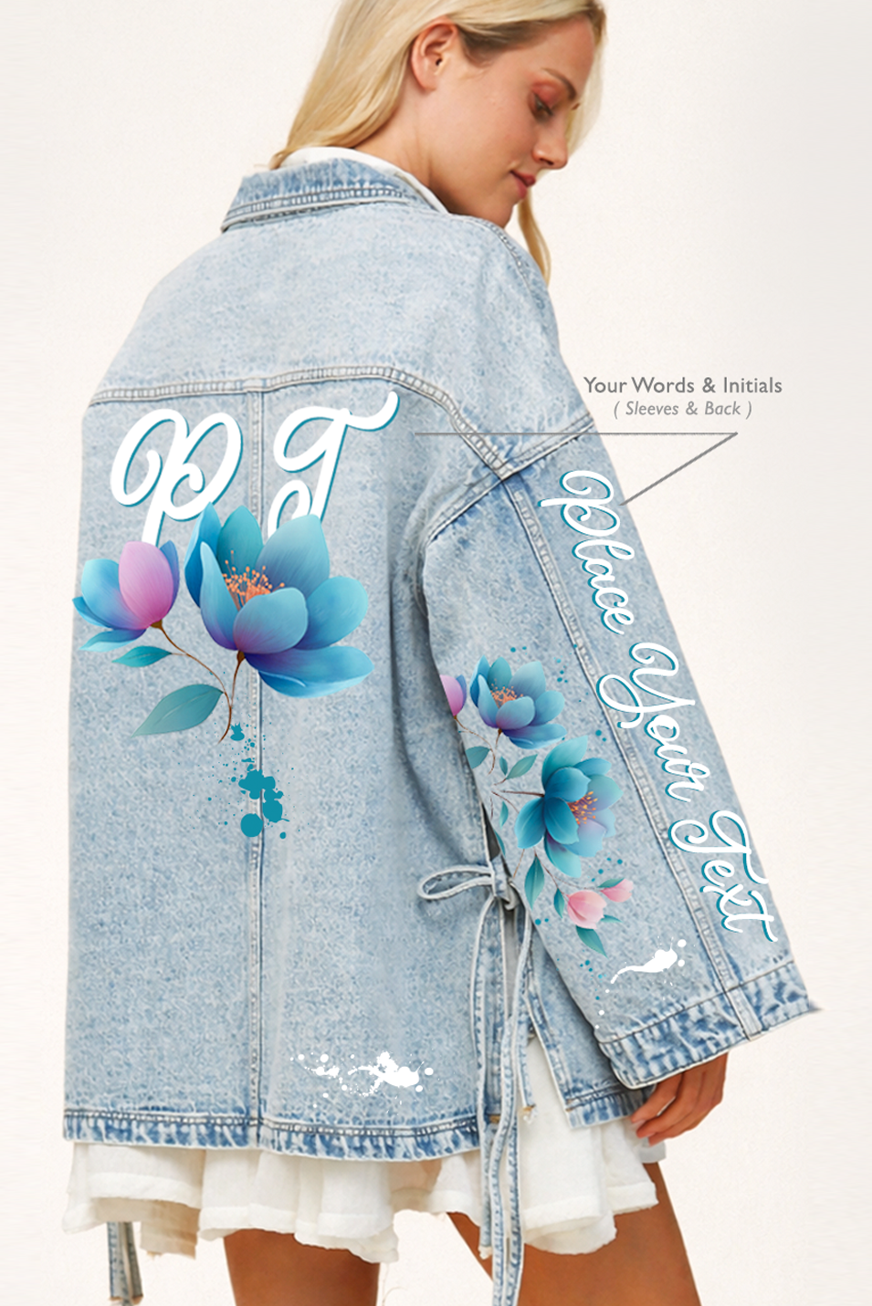 A beautifully styled light denim jacket featuring elegant floral artwork and personalized lettering that turns a classic piece into a statement. Soft blue blossoms and flowing initials create a graceful, feminine look, while the customizable sleeve text makes it uniquely yours. Wear your story, stand out with style, and make every outfit unforgettable.