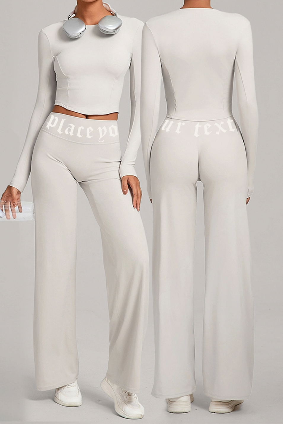 Round neckline for comfortable support. Flared leg opening provides freedom of movement and modern silhouette with customizable text adds a unique, expressive touch—so you can wear your words and make the piece truly your own.